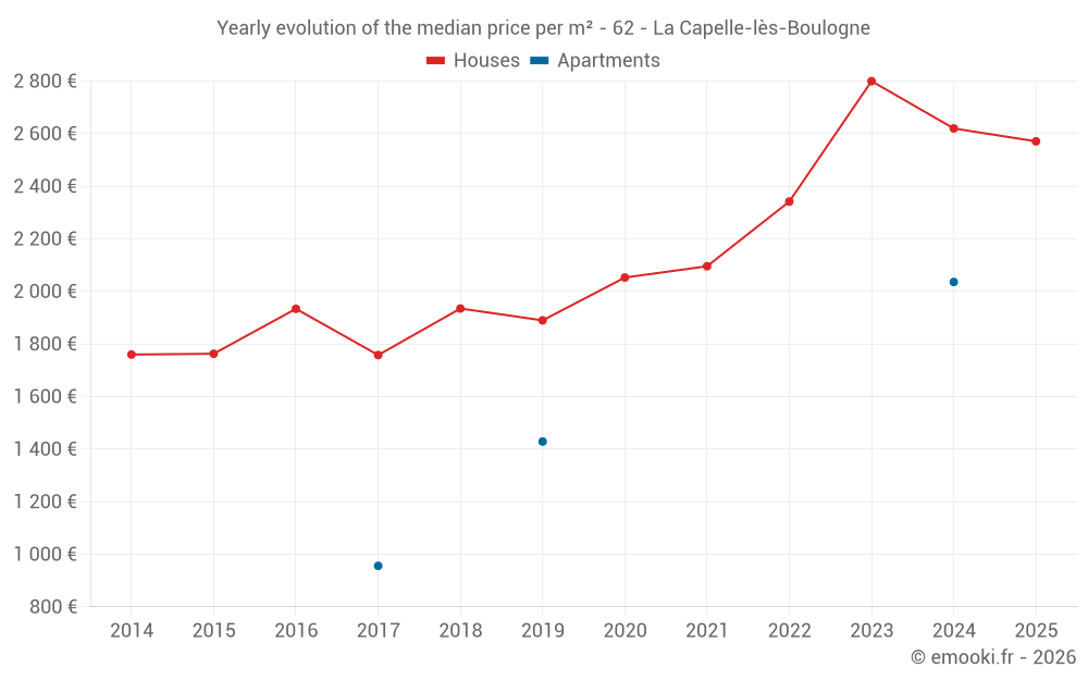 The median price on the 16 house transactions of the last 12 months in the municipality of La Capelle-lès-Boulogne was 2 620 € per square meter for a median property value of 274 150 €. Over this period, 60% of transactions were between 1 803 and 2 785 € per square meter (from the 2nd to the 8th deciles).