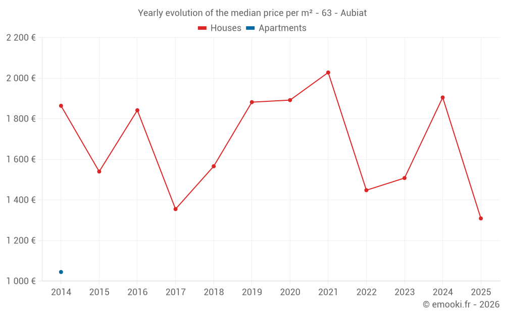 The median price on the 21 house transactions of the last 24 months in the municipality of Aubiat was 1 807 € per square meter for a median property value of 140 200 €. Over this period, 60% of transactions were between 1 296 and 2 143 € per square meter (from the 2nd to the 8th deciles).