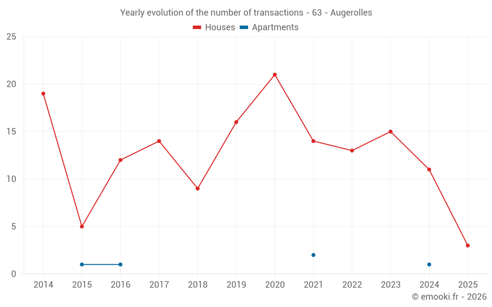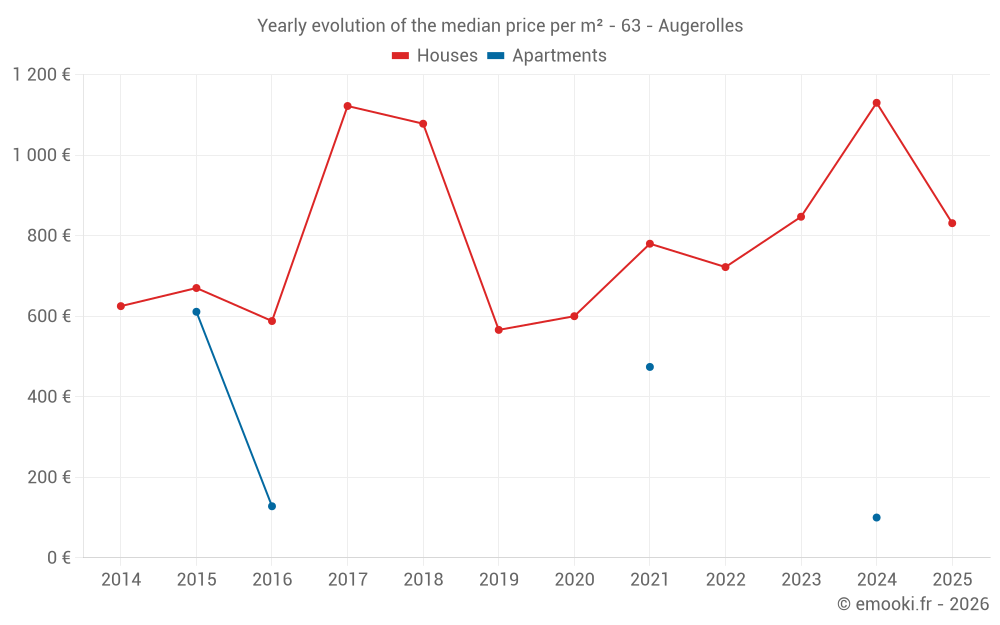 The median price on the 22 house transactions of the last 24 months in the municipality of Augerolles was 1 120 € per square meter for a median property value of 82 000 €. Over this period, 60% of transactions were between 390 and 1 812 € per square meter (from the 2nd to the 8th deciles).