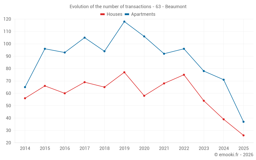 The median price on the 26 house transactions of the last 6 months in the municipality of Beaumont was 2 755 € per square meter for a median property value of 213 500 €. Over this period, 60% of transactions were between 1 719 and 3 423 € per square meter (from the 2nd to the 8th deciles).