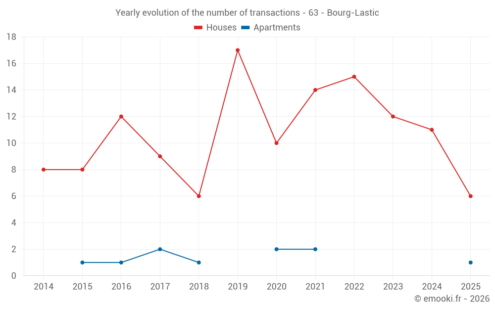 The median price on the 21 house transactions of the last 24 months in the municipality of Bourg-Lastic was 817 € per square meter for a median property value of 55 000 €. Over this period, 60% of transactions were between 372 and 1 102 € per square meter (from the 2nd to the 8th deciles).