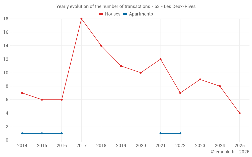 The median price on the 18 house transactions of the last 24 months in the municipality of Les Deux-Rives was 2 033 € per square meter for a median property value of 193 250 €. Over this period, 60% of transactions were between 1 437 and 2 362 € per square meter (from the 2nd to the 8th deciles).