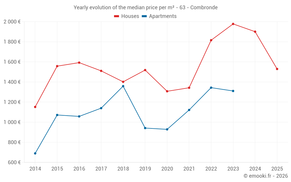 The median price on the 30 house transactions of the last 12 months in the municipality of Combronde was 1 576 € per square meter for a median property value of 119 650 €. Over this period, 60% of transactions were between 854 and 2 205 € per square meter (from the 2nd to the 8th deciles).