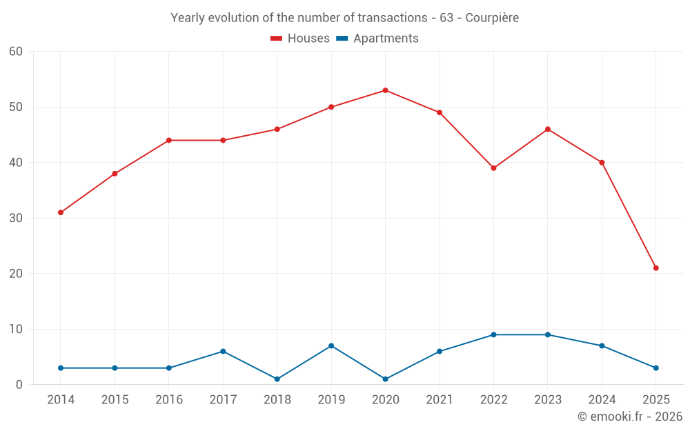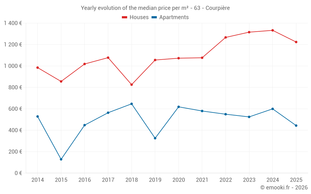 The median price on the 21 house transactions of the last 6 months in the municipality of Courpière was 1 224 € per square meter for a median property value of 99 500 €. Over this period, 60% of transactions were between 286 and 1 696 € per square meter (from the 2nd to the 8th deciles).