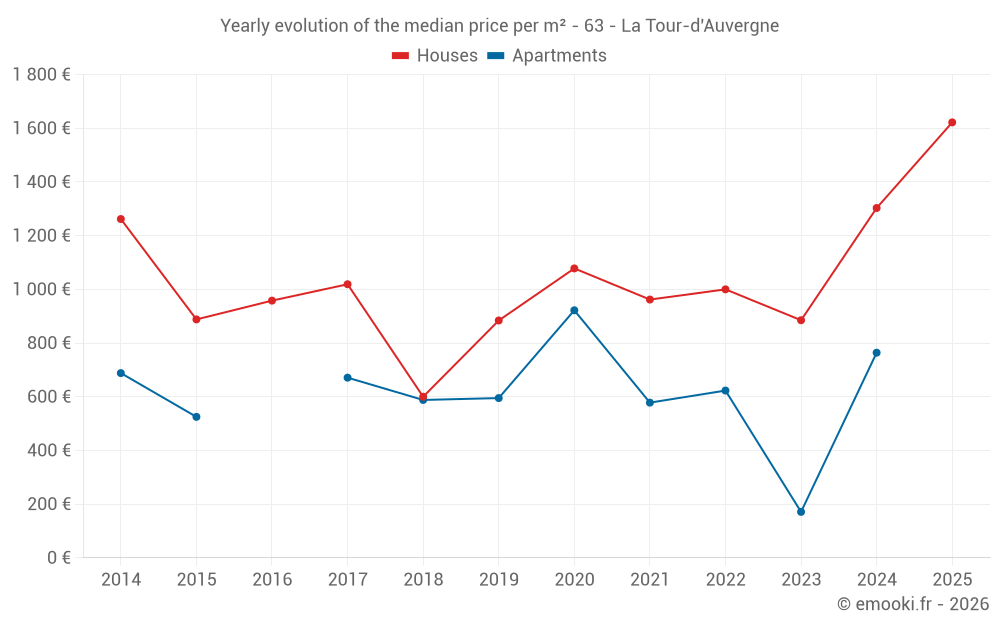 The median price on the 23 house transactions of the last 24 months in the municipality of La Tour-d'Auvergne was 1 344 € per square meter for a median property value of 95 000 €. Over this period, 60% of transactions were between 829 and 1 830 € per square meter (from the 2nd to the 8th deciles).