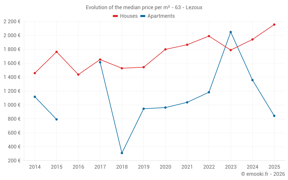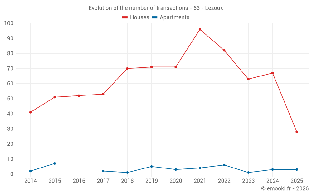 The median price on the 28 house transactions of the last 6 months in the municipality of Lezoux was 2 156 € per square meter for a median property value of 191 790 €. Over this period, 60% of transactions were between 1 494 and 2 552 € per square meter (from the 2nd to the 8th deciles).