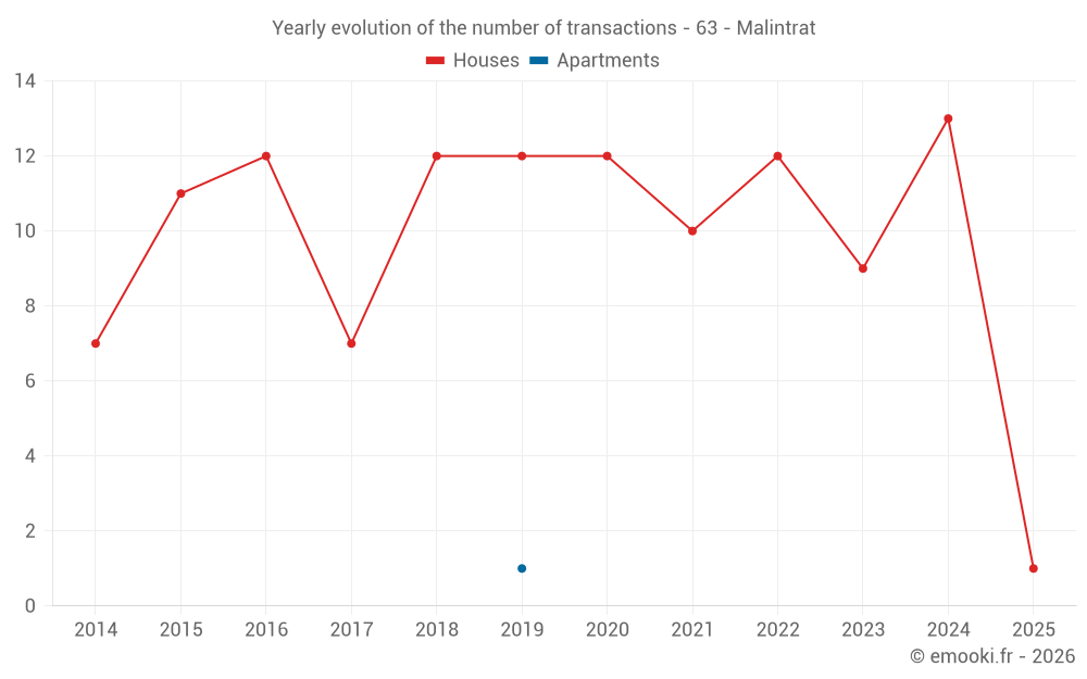 The median price on the 17 house transactions of the last 24 months in the municipality of Malintrat was 2 316 € per square meter for a median property value of 240 000 €. Over this period, 60% of transactions were between 1 632 and 2 776 € per square meter (from the 2nd to the 8th deciles).