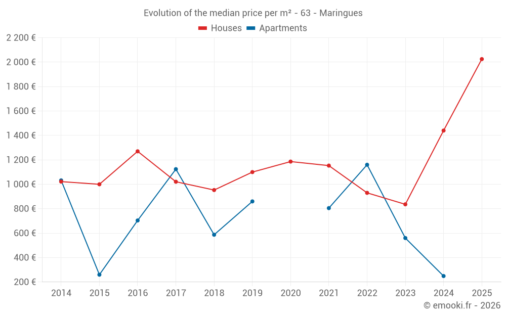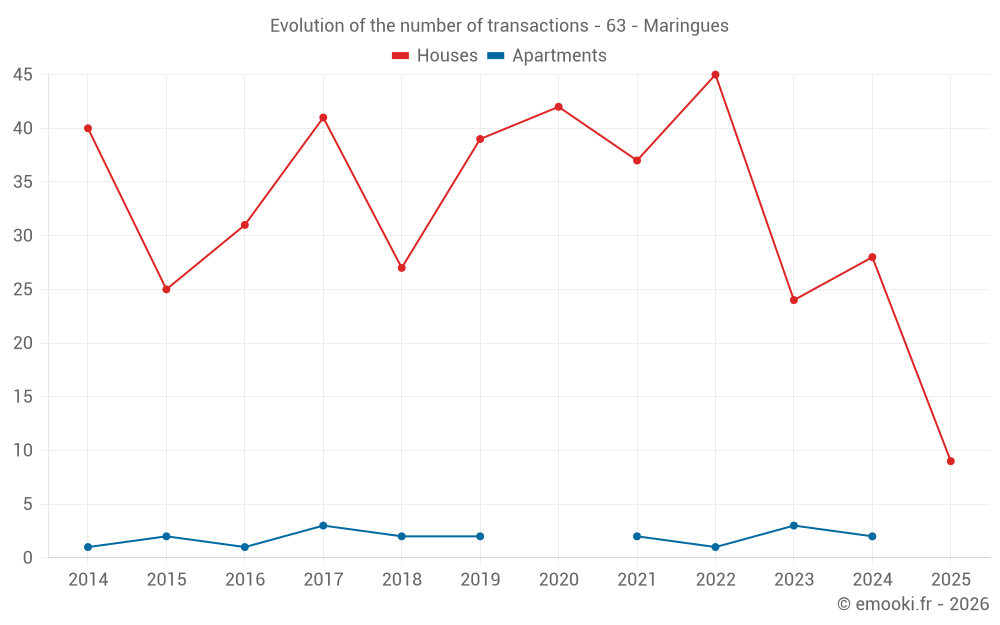The median price on the 26 house transactions of the last 12 months in the municipality of Maringues was 1 481 € per square meter for a median property value of 139 712 €. Over this period, 60% of transactions were between 515 and 2 355 € per square meter (from the 2nd to the 8th deciles).