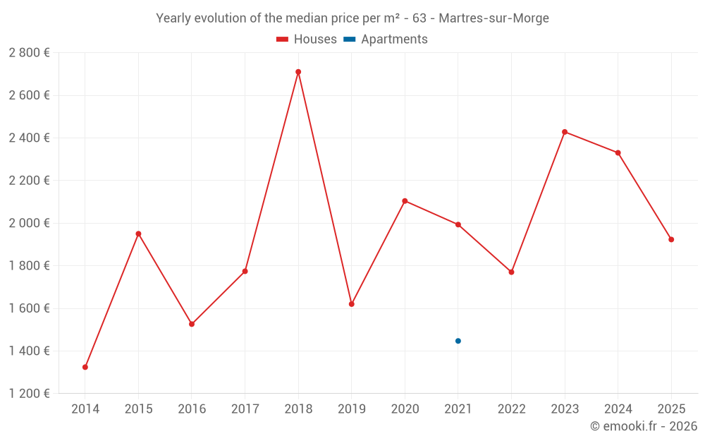 The median price on the 15 house transactions of the last 24 months in the municipality of Martres-sur-Morge was 2 330 € per square meter for a median property value of 233 600 €. Over this period, 60% of transactions were between 1 875 and 2 968 € per square meter (from the 2nd to the 8th deciles).