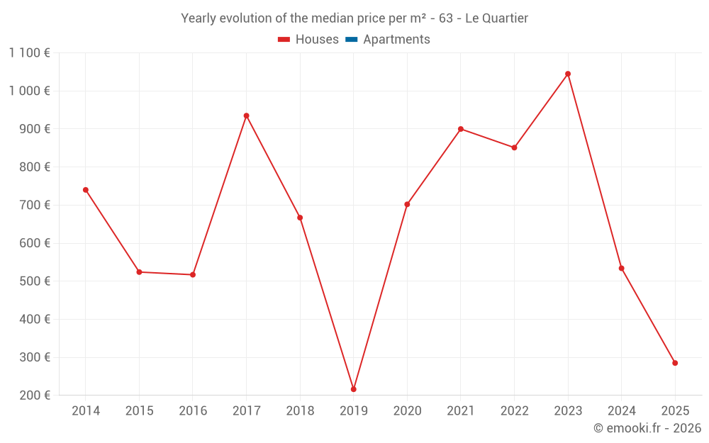 The median price on the 14 house transactions of the last 24 months in the municipality of Le Quartier was 679 € per square meter for a median property value of 57 500 €. Over this period, 60% of transactions were between 361 and 1 403 € per square meter (from the 2nd to the 8th deciles).