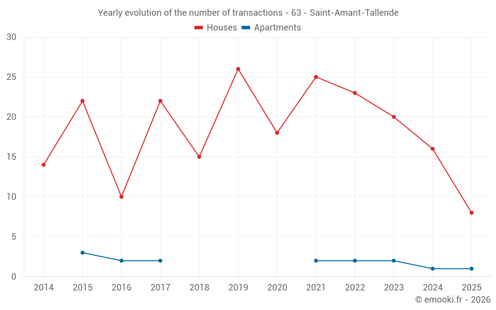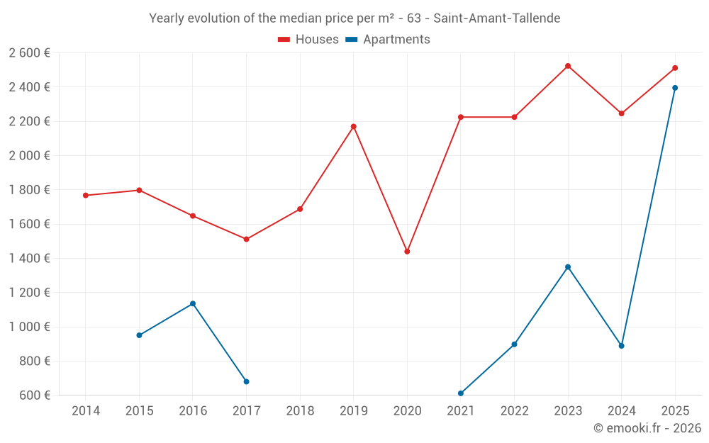 The median price on the 16 house transactions of the last 12 months in the municipality of Saint-Amant-Tallende was 2 314 € per square meter for a median property value of 242 250 €. Over this period, 60% of transactions were between 1 003 and 2 753 € per square meter (from the 2nd to the 8th deciles).