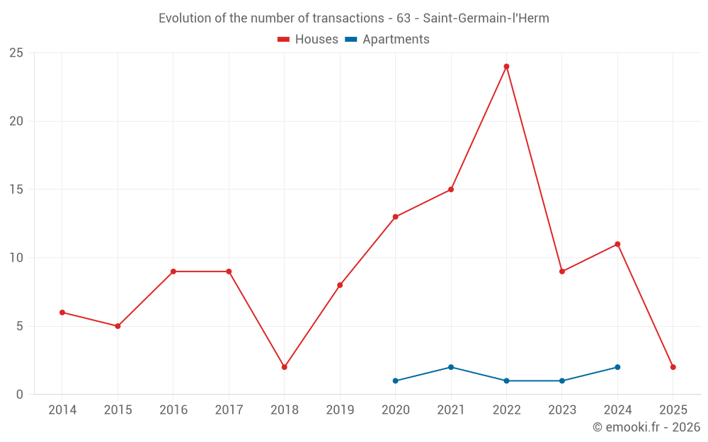 The median price on the 15 house transactions of the last 24 months in the municipality of Saint-Germain-l'Herm was 949 € per square meter for a median property value of 85 100 €. Over this period, 60% of transactions were between 499 and 1 602 € per square meter (from the 2nd to the 8th deciles).