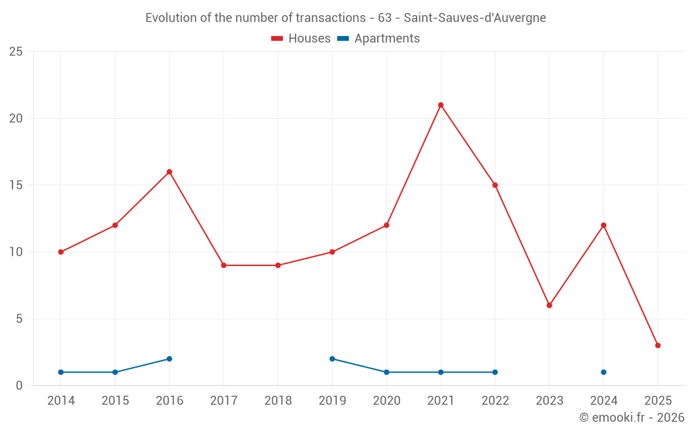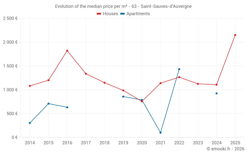 The median price on the 17 house transactions of the last 24 months in the municipality of Saint-Sauves-d'Auvergne was 1 275 € per square meter for a median property value of 124 030 €. Over this period, 60% of transactions were between 648 and 2 273 € per square meter (from the 2nd to the 8th deciles).