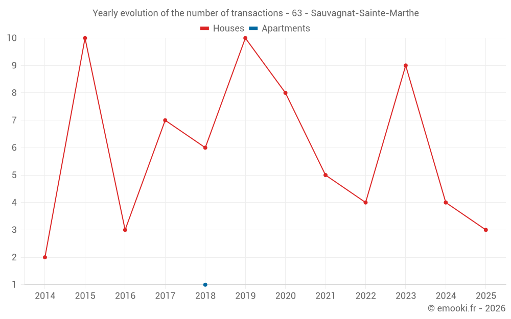 The median price on the 14 house transactions of the last 24 months in the municipality of Sauvagnat-Sainte-Marthe was 1 186 € per square meter for a median property value of 132 500 €. Over this period, 60% of transactions were between 834 and 2 157 € per square meter (from the 2nd to the 8th deciles).