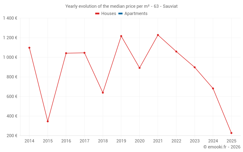 The median price on the 15 house transactions of the last 24 months in the municipality of Sauviat was 745 € per square meter for a median property value of 74 100 €. Over this period, 60% of transactions were between 222 and 1 770 € per square meter (from the 2nd to the 8th deciles).