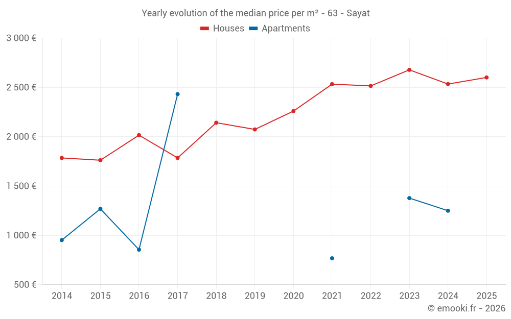 The median price on the 20 house transactions of the last 12 months in the municipality of Sayat was 2 601 € per square meter for a median property value of 226 475 €. Over this period, 60% of transactions were between 1 694 and 3 470 € per square meter (from the 2nd to the 8th deciles).