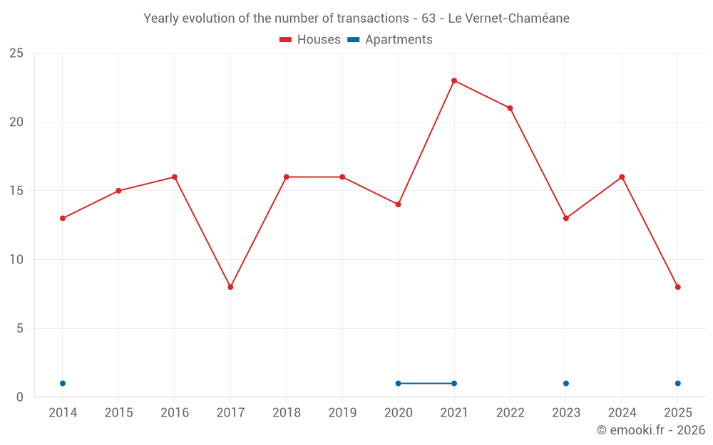 The median price on the 19 house transactions of the last 12 months in the municipality of Le Vernet-Chaméane was 1 058 € per square meter for a median property value of 100 000 €. Over this period, 60% of transactions were between 604 and 1 516 € per square meter (from the 2nd to the 8th deciles).
