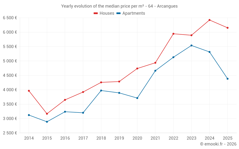 The median price on the 26 house transactions of the last 12 months in the municipality of Arcangues was 6 416 € per square meter for a median property value of 840 768 €. Over this period, 60% of transactions were between 4 975 and 8 836 € per square meter (from the 2nd to the 8th deciles).