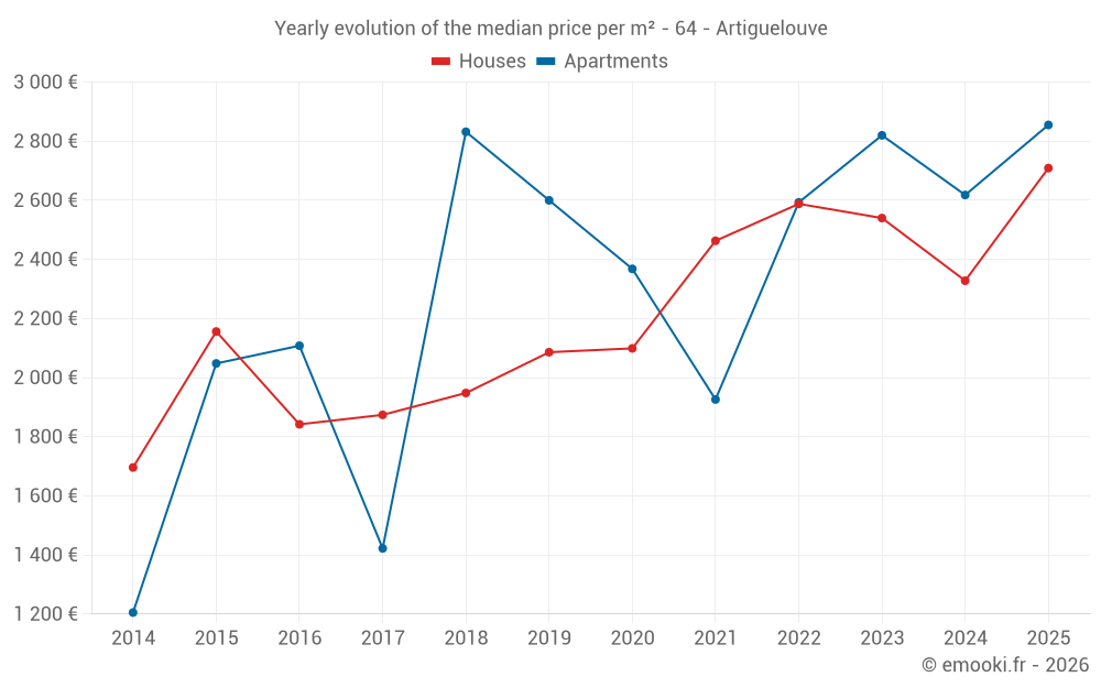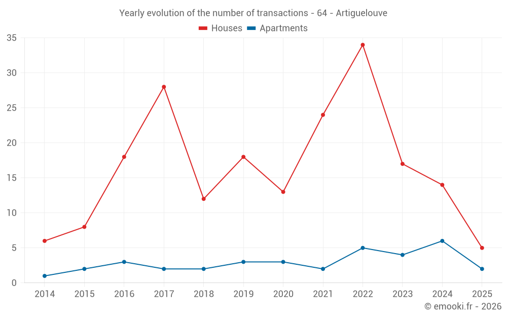 The median price on the 23 house transactions of the last 24 months in the municipality of Artiguelouve was 2 523 € per square meter for a median property value of 242 000 €. Over this period, 60% of transactions were between 2 082 and 2 927 € per square meter (from the 2nd to the 8th deciles).