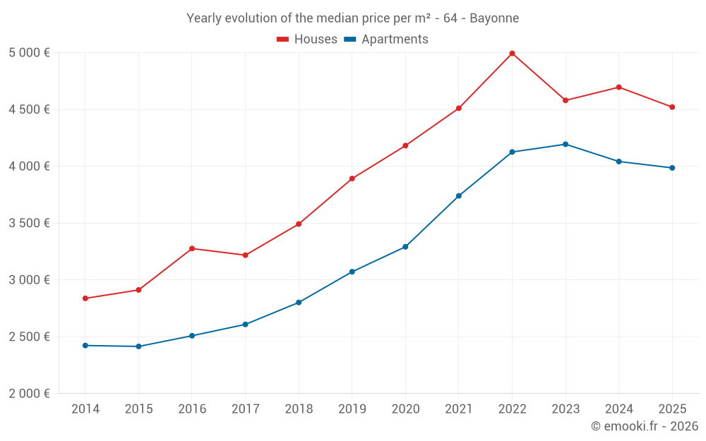 The median price on the 20 house transactions of the last 3 months in the municipality of Bayonne was 4 470 € per square meter for a median property value of 472 075 €. Over this period, 60% of transactions were between 3 722 and 5 573 € per square meter (from the 2nd to the 8th deciles).