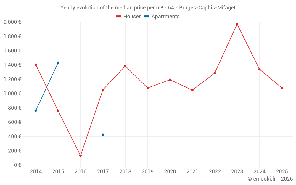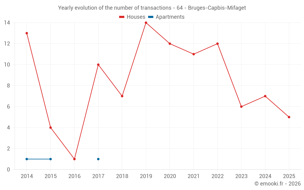 The median price on the 14 house transactions of the last 24 months in the municipality of Bruges-Capbis-Mifaget was 1 210 € per square meter for a median property value of 158 375 €. Over this period, 60% of transactions were between 921 and 1 672 € per square meter (from the 2nd to the 8th deciles).