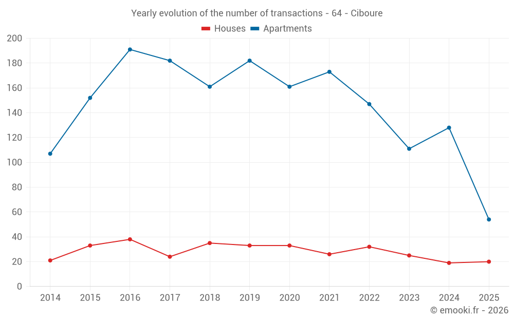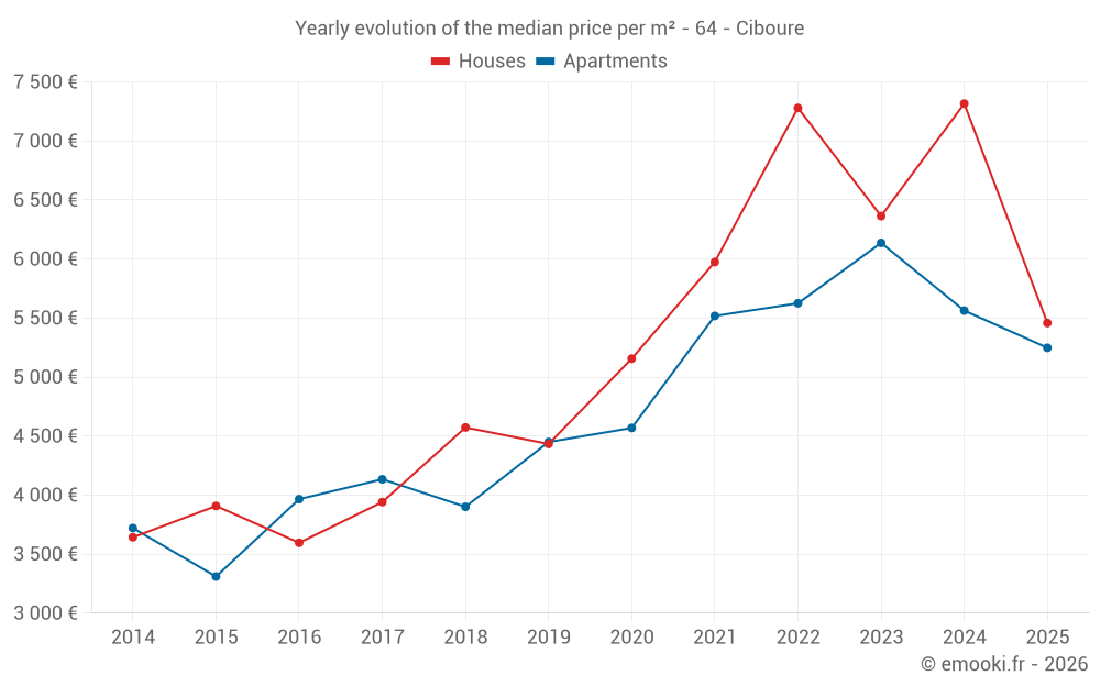 The median price on the 20 house transactions of the last 6 months in the municipality of Ciboure was 5 458 € per square meter for a median property value of 615 000 €. Over this period, 60% of transactions were between 4 340 and 7 624 € per square meter (from the 2nd to the 8th deciles).