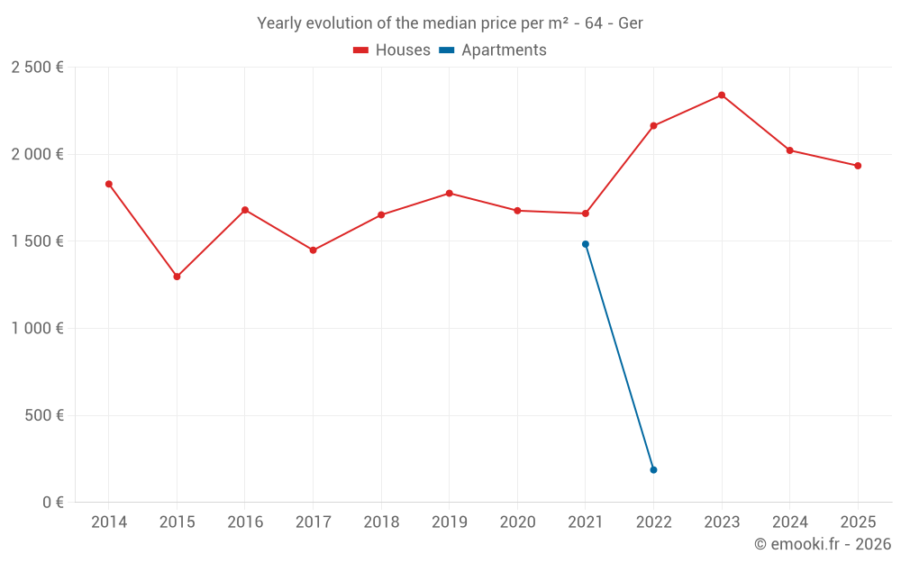 The median price on the 31 house transactions of the last 24 months in the municipality of Ger was 2 070 € per square meter for a median property value of 251 878 €. Over this period, 60% of transactions were between 1 341 and 2 702 € per square meter (from the 2nd to the 8th deciles).