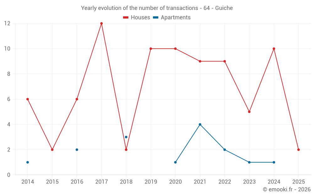 The median price on the 15 house transactions of the last 24 months in the municipality of Guiche was 2 708 € per square meter for a median property value of 311 094 €. Over this period, 60% of transactions were between 1 619 and 3 396 € per square meter (from the 2nd to the 8th deciles).