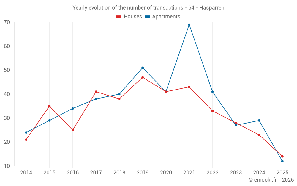 The median price on the 25 apartment transactions of the last 12 months in the municipality of Hasparren was 3 306 € per square meter for a median property value of 200 000 €. Over this period, 60% of transactions were between 1 968 and 3 613 € per square meter (from the 2nd to the 8th deciles).