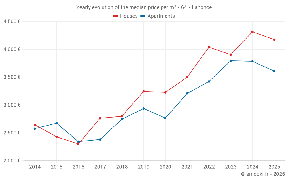 The median price on the 24 apartment transactions of the last 24 months in the municipality of Lahonce was 3 724 € per square meter for a median property value of 240 000 €. Over this period, 60% of transactions were between 3 514 and 4 087 € per square meter (from the 2nd to the 8th deciles).