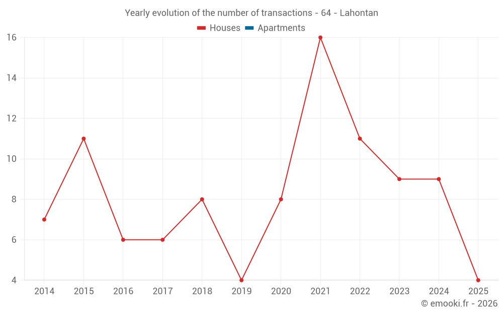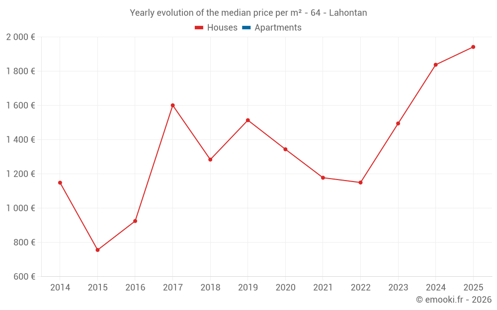 The median price on the 17 house transactions of the last 24 months in the municipality of Lahontan was 1 835 € per square meter for a median property value of 182 488 €. Over this period, 60% of transactions were between 1 157 and 2 340 € per square meter (from the 2nd to the 8th deciles).