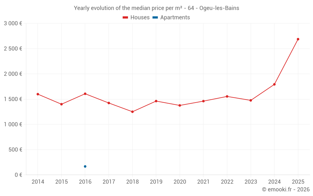 The median price on the 16 house transactions of the last 24 months in the municipality of Ogeu-les-Bains was 1 768 € per square meter for a median property value of 141 403 €. Over this period, 60% of transactions were between 1 025 and 2 333 € per square meter (from the 2nd to the 8th deciles).