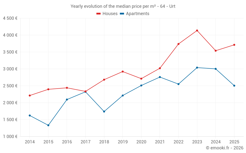 The median price on the 22 house transactions of the last 24 months in the municipality of Urt was 3 567 € per square meter for a median property value of 362 000 €. Over this period, 60% of transactions were between 2 887 and 4 272 € per square meter (from the 2nd to the 8th deciles).