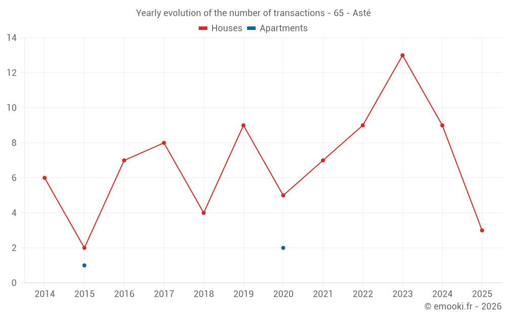 The median price on the 19 house transactions of the last 24 months in the municipality of Asté was 1 160 € per square meter for a median property value of 129 000 €. Over this period, 60% of transactions were between 944 and 2 173 € per square meter (from the 2nd to the 8th deciles).