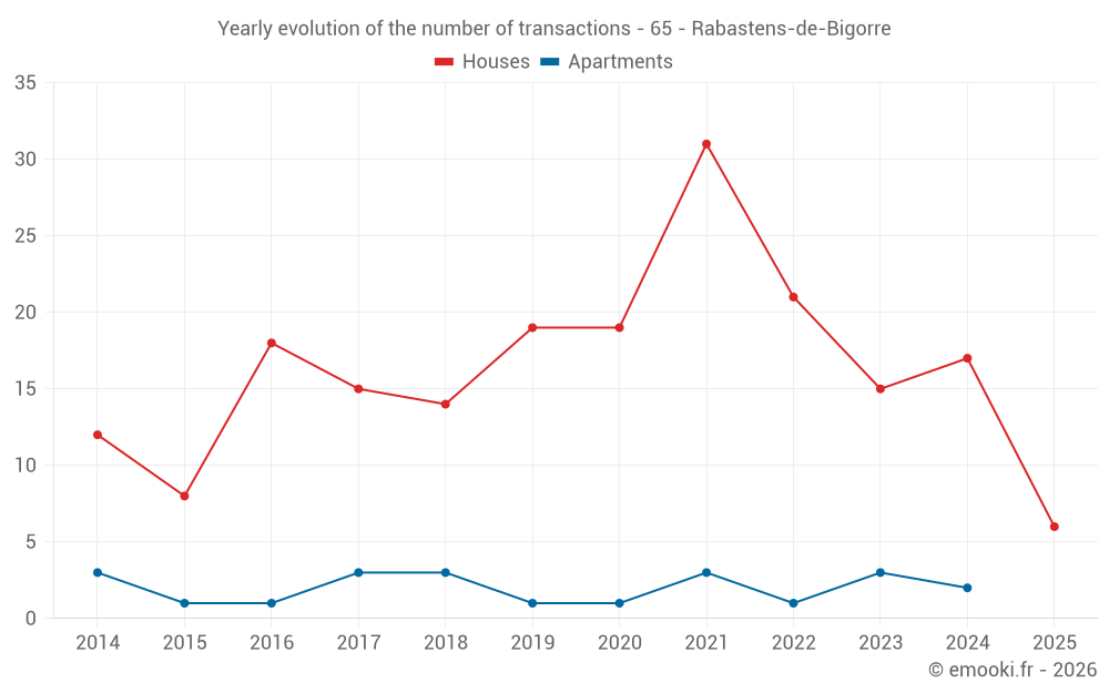 The median price on the 18 house transactions of the last 12 months in the municipality of Rabastens-de-Bigorre was 1 486 € per square meter for a median property value of 127 000 €. Over this period, 60% of transactions were between 1 120 and 1 801 € per square meter (from the 2nd to the 8th deciles).