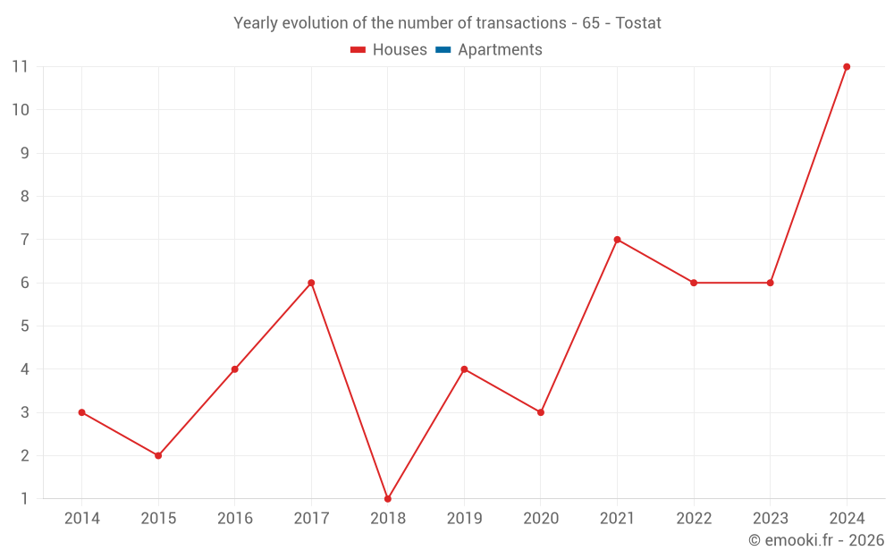 The median price on the 15 house transactions of the last 24 months in the municipality of Tostat was 1 501 € per square meter for a median property value of 210 500 €. Over this period, 60% of transactions were between 1 192 and 2 131 € per square meter (from the 2nd to the 8th deciles).