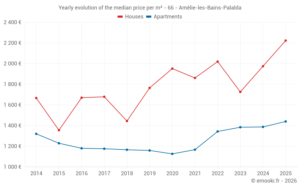 The median price on the 26 house transactions of the last 12 months in the municipality of Amélie-les-Bains-Palalda was 2 085 € per square meter for a median property value of 167 000 €. Over this period, 60% of transactions were between 1 506 and 2 587 € per square meter (from the 2nd to the 8th deciles).