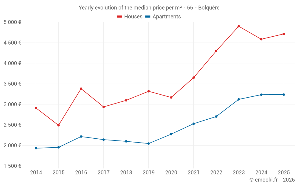 The median price on the 30 house transactions of the last 12 months in the municipality of Bolquère was 4 715 € per square meter for a median property value of 347 000 €. Over this period, 60% of transactions were between 3 590 and 6 284 € per square meter (from the 2nd to the 8th deciles).