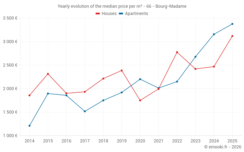 The median price on the 17 house transactions of the last 24 months in the municipality of Bourg-Madame was 2 469 € per square meter for a median property value of 247 000 €. Over this period, 60% of transactions were between 1 551 and 4 447 € per square meter (from the 2nd to the 8th deciles).