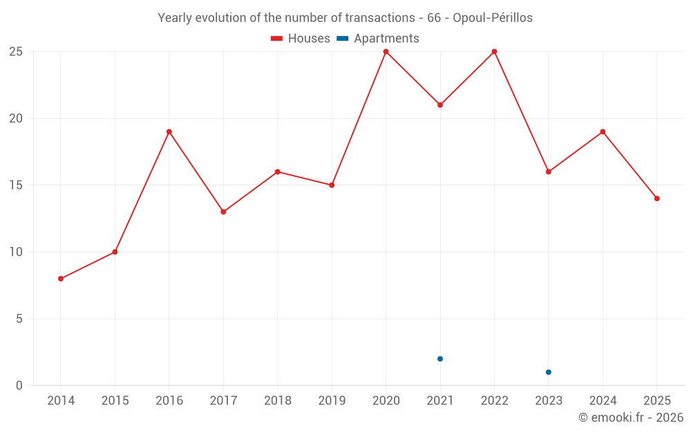 The median price on the 33 house transactions of the last 24 months in the municipality of Opoul-Périllos was 1 947 € per square meter for a median property value of 179 000 €. Over this period, 60% of transactions were between 892 and 2 462 € per square meter (from the 2nd to the 8th deciles).