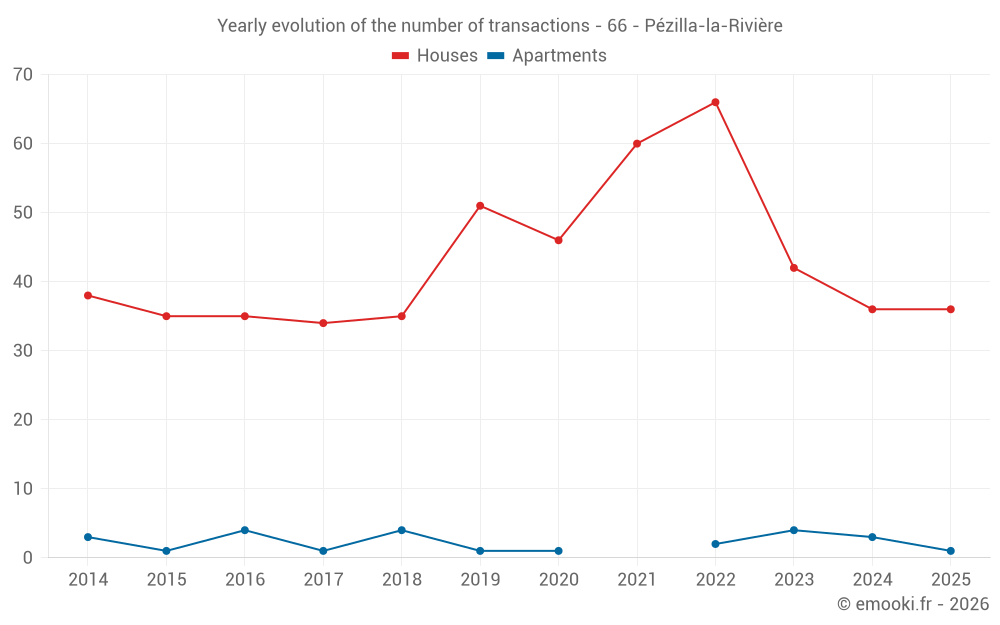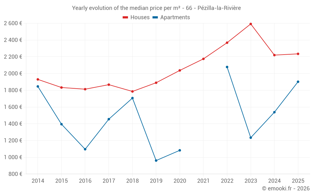 The median price on the 36 house transactions of the last 6 months in the municipality of Pézilla-la-Rivière was 2 235 € per square meter for a median property value of 172 725 €. Over this period, 60% of transactions were between 1 233 and 2 873 € per square meter (from the 2nd to the 8th deciles).