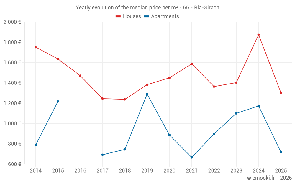 The median price on the 24 house transactions of the last 12 months in the municipality of Ria-Sirach was 1 304 € per square meter for a median property value of 106 000 €. Over this period, 60% of transactions were between 955 and 2 323 € per square meter (from the 2nd to the 8th deciles).