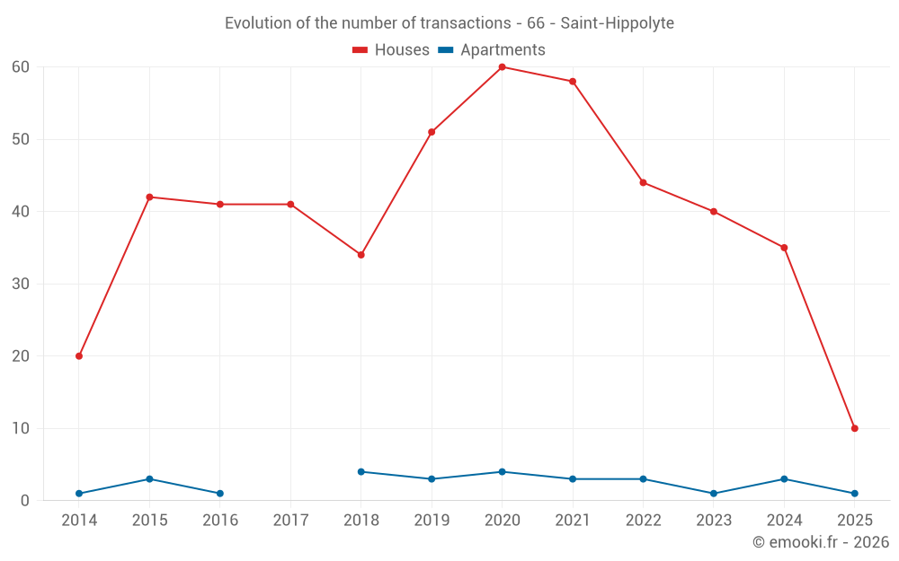 The median price on the 29 house transactions of the last 12 months in the municipality of Saint-Hippolyte was 2 557 € per square meter for a median property value of 181 200 €. Over this period, 60% of transactions were between 1 481 and 3 142 € per square meter (from the 2nd to the 8th deciles).