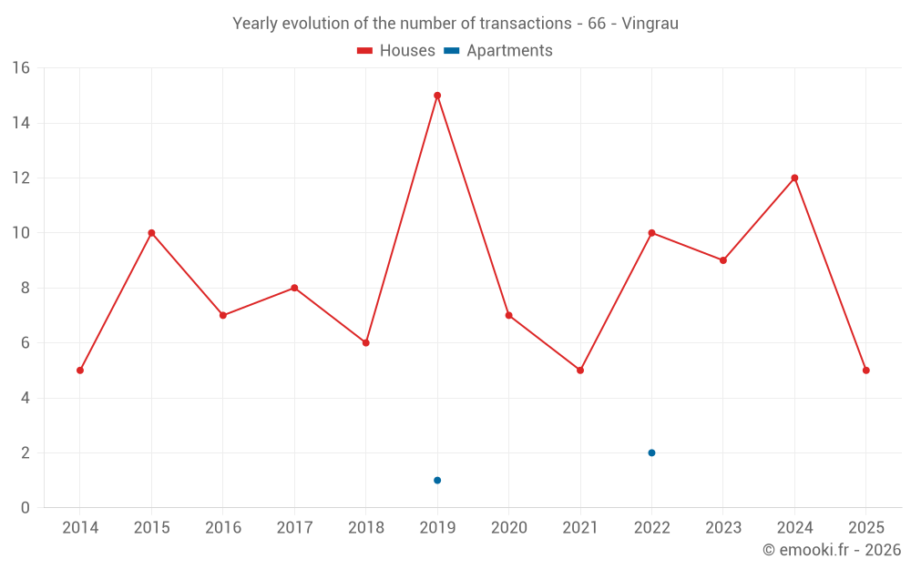 The median price on the 23 house transactions of the last 24 months in the municipality of Vingrau was 1 281 € per square meter for a median property value of 110 000 €. Over this period, 60% of transactions were between 915 and 2 515 € per square meter (from the 2nd to the 8th deciles).