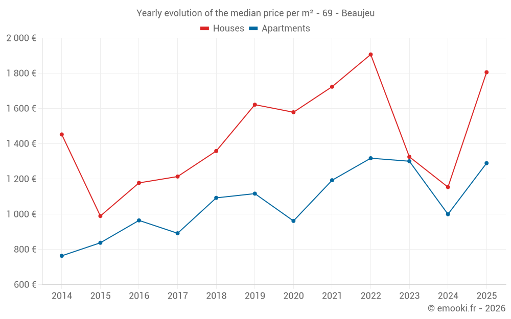 The median price on the 18 house transactions of the last 12 months in the municipality of Beaujeu was 1 444 € per square meter for a median property value of 138 000 €. Over this period, 60% of transactions were between 885 and 2 595 € per square meter (from the 2nd to the 8th deciles).