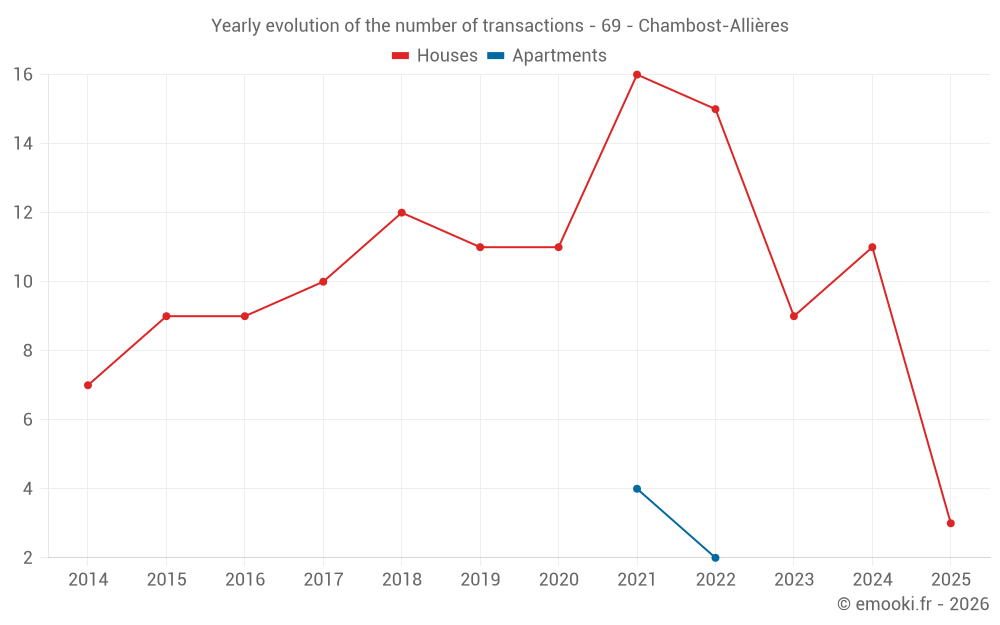 The median price on the 20 house transactions of the last 24 months in the municipality of Chambost-Allières was 2 563 € per square meter for a median property value of 216 900 €. Over this period, 60% of transactions were between 1 468 and 3 163 € per square meter (from the 2nd to the 8th deciles).