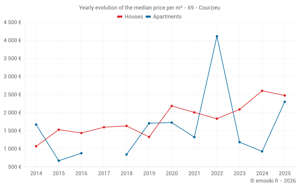 The median price on the 25 house transactions of the last 24 months in the municipality of Courzieu was 2 605 € per square meter for a median property value of 210 000 €. Over this period, 60% of transactions were between 1 498 and 3 141 € per square meter (from the 2nd to the 8th deciles).