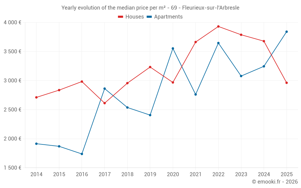 The median price on the 29 house transactions of the last 24 months in the municipality of Fleurieux-sur-l'Arbresle was 3 581 € per square meter for a median property value of 377 560 €. Over this period, 60% of transactions were between 2 678 and 4 461 € per square meter (from the 2nd to the 8th deciles).
