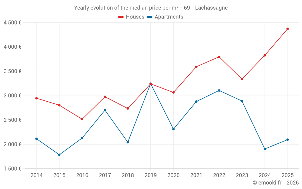 The median price on the 15 house transactions of the last 24 months in the municipality of Lachassagne was 4 271 € per square meter for a median property value of 503 850 €. Over this period, 60% of transactions were between 3 818 and 4 629 € per square meter (from the 2nd to the 8th deciles).