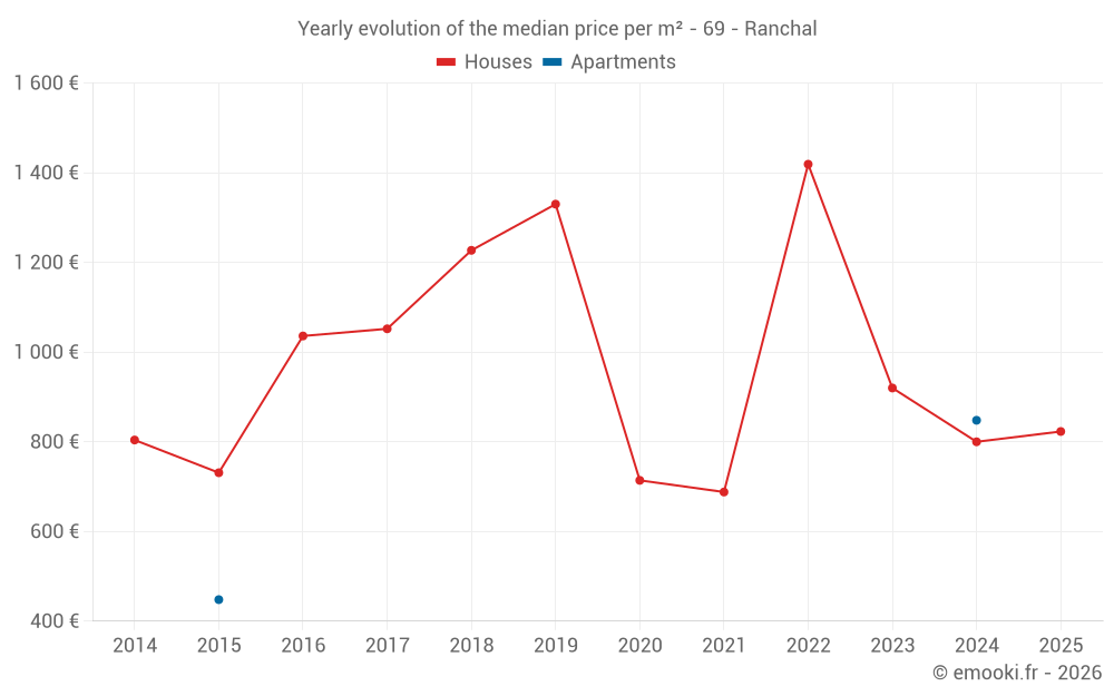 The median price on the 16 house transactions of the last 24 months in the municipality of Ranchal was 812 € per square meter for a median property value of 82 050 €. Over this period, 60% of transactions were between 570 and 1 000 € per square meter (from the 2nd to the 8th deciles).
